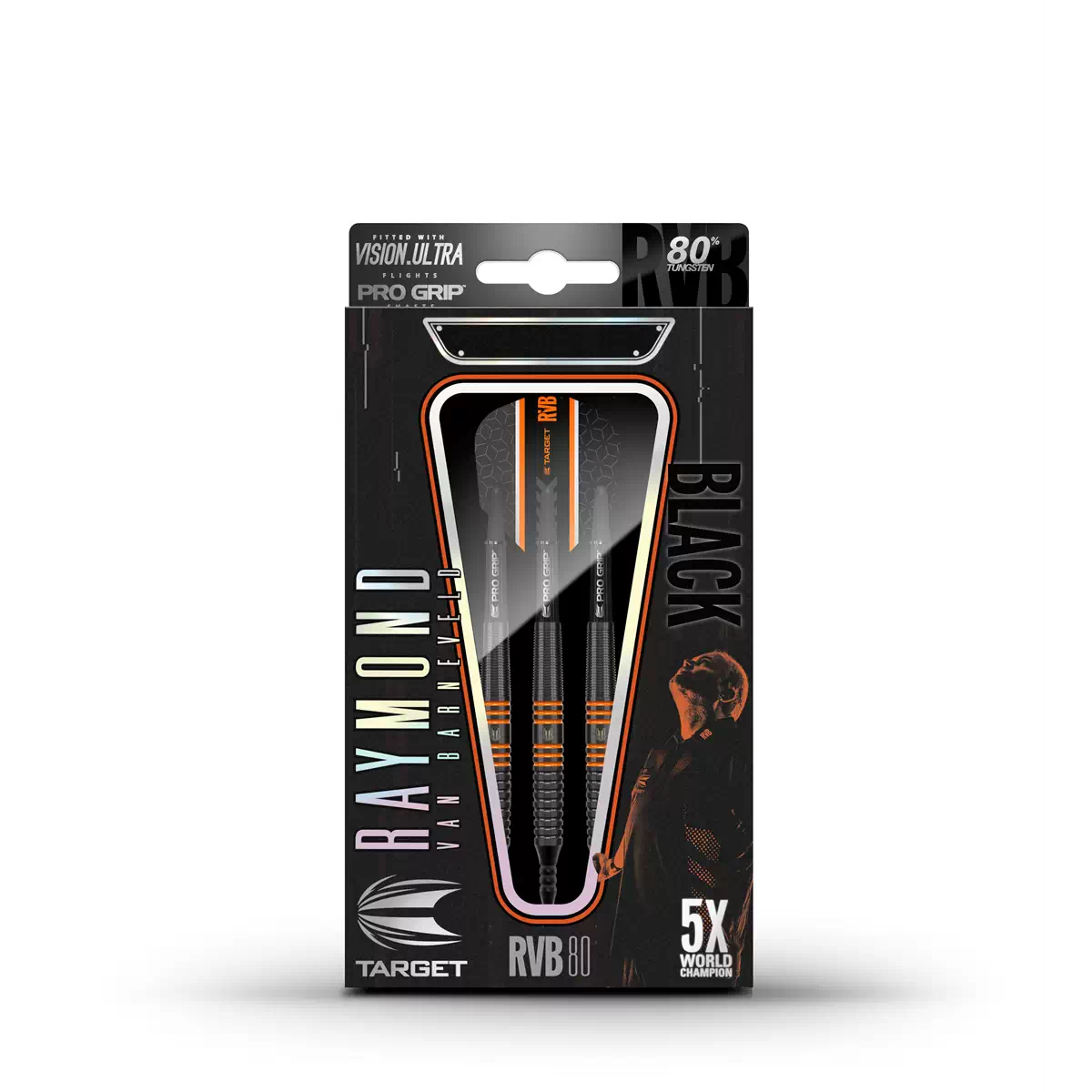 Endorsed by the 5 Time World Champion, we are pleased to introduce Barney's faultlessly designed RVB 80% Black. This 80% Tungsten barrel features detailed, radial grooves, overlaid with Black Titanium Nitride Coating which delivers enhanced grip and barrel protection. The barrel is highlighted with vivid RVB orange colored ring sections, ensuring your dart will stand out from the rest. The RVB 80% Black comes fitted with Black Pixel Tip, Target Pro Grip shaft, and new Vision Ultra RVB Black flight which have been specifically designed to compliment this stunning dart.